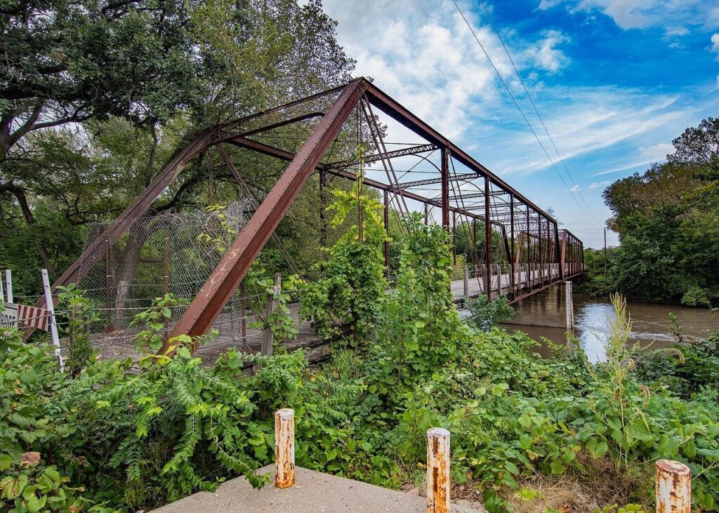 This two-span wrought iron truss bridge spanning the North Raccoon River on the east edge of Adel was fabricated by the King Iron Bridge and Manufacturing Company of Cleveland Ohio. The bridge served as the primary river crossing into Adel from the time it was erected in 1882 until 1932 when the U.S. Highway 6 bridge was completed not far to the south. In its history the crossing was a part of the River to River Road, the Detroit Lincoln Denver Highway, US 32 and for the first few months, US 6. After 1932, the bridge continued to serve secondary road traffic until 2000 when it was closed due to structural concerns.
