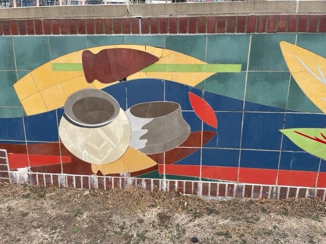 This mural near Principal Park was constructed in 2010 to help mark the birthplace of the City of Des Moines. The 34 foot long mosaic designed by Des Moines artist Hilde DeBruyne is constructed of over 500 painted porcelain tiles produced by Robert Sawyer of Creative Edge Master Shop in Fairfield. The mural’s creation was sponsored by the Polk County Historical Society.