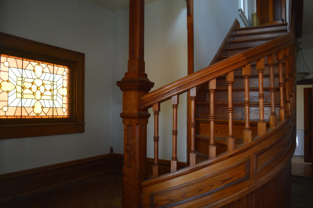 This spacious former residence of the Jacob and Martha George family was built in 1892. The Queen Anne style home is one of the few houses built in the 1800s remaining in North Liberty and retains many original features including a wraparound porch and turret on the exterior as well as wood flooring, and staircase, pocket doors and other millwork on the interior.