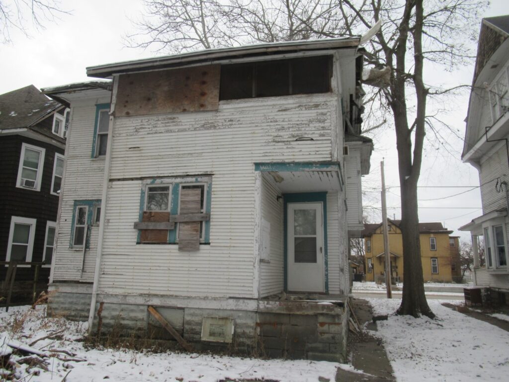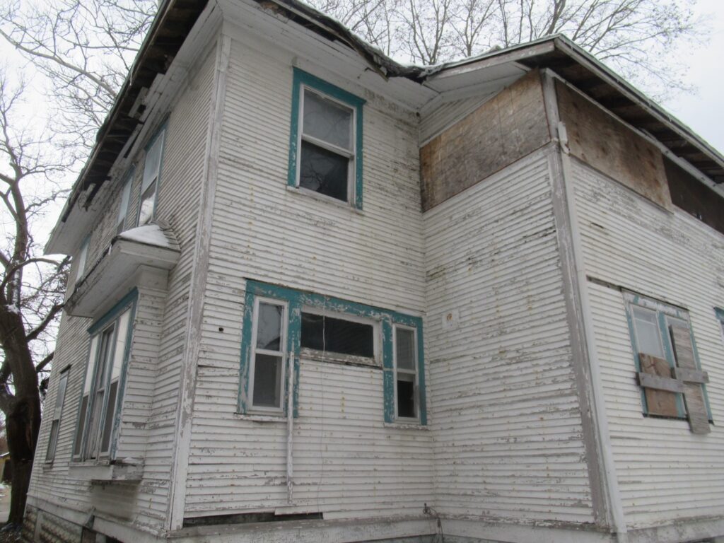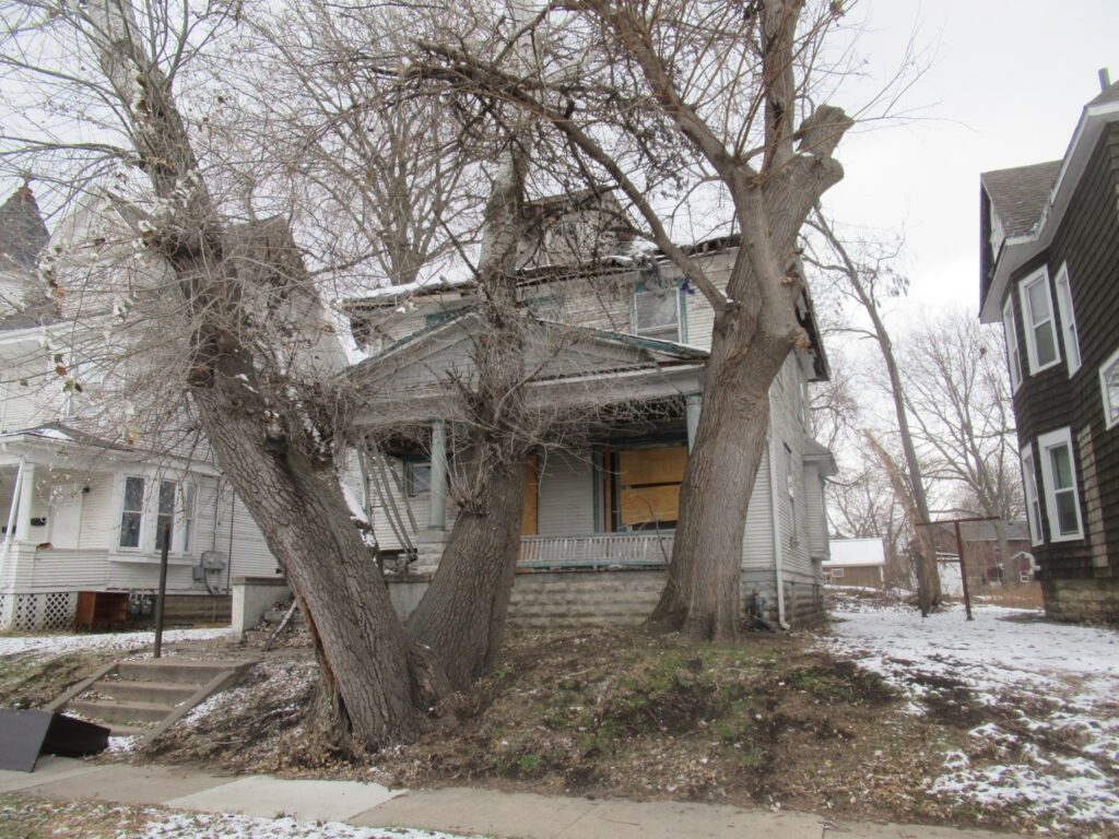 Built in 1913, this once grand Four Square plan house has fallen into serious disrepair. Distinctive features of its Colonial Revival style, however, such as the round classical columns and the pedimented gable on the porch remain. The house is located near the Cedar River in what was a historically redlined area, a section designated by lenders as high risk for investment. Consequently, the neighborhood residents who were predominately African-Americans and other minorities were unable to get loans or even insure their properties.