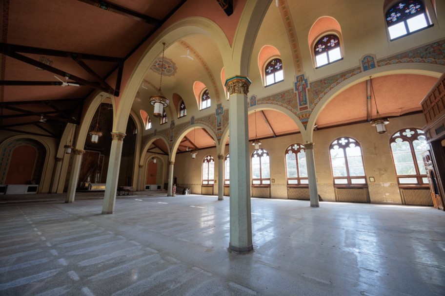 Some of the religious objects and structural elements of Sacred Heart Church including the pew ends and many of the stained-glass windows were removed and reused in the new church. However, much of the interior architectural elements, the wooden confessionals, and the decorative detailing and stenciling on the interior walls remain.
